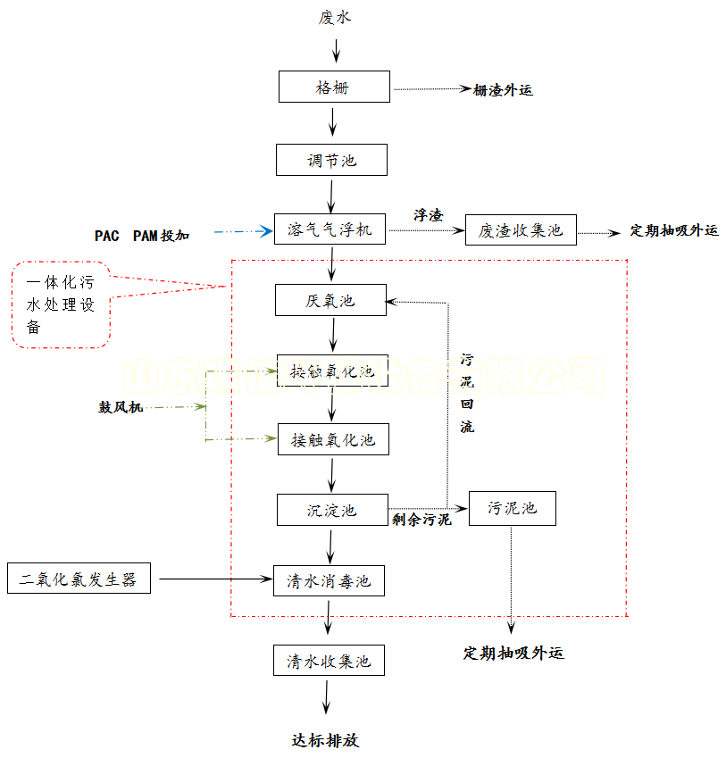 廢水首先經過機械格柵進入處置系統,格柵可以去除廢水中較大粒徑的懸浮物、漂浮物、皮毛、肉屑、骨屑、血污等雜質,出水進入隔油調理池,此池前部為隔油池,去除廢水中部分油脂,后部為調理池,對水量及水質中止調理。調理池出水由提升泵提升至氣浮池,氣浮采用一元化氣浮裝置,它由池體,溶氣罐、空壓機及回流水泵組成,由一個電控箱中止控制操作。廢水中有大批的粗大懸浮物及油脂,經過氣浮裝置的處置可大大降低上述污染物濃度,在氣浮設備義務時參與高分子絮凝劑,廢水經加藥反響后進入氣浮池內,與經過TJ型釋放器釋放的氣泡充分混合接觸,使水中的絮凝體粘附在宏大氣泡上,釋放的氣泡平均直徑Φ30um左右,絮體浮向水面構成浮渣,浮渣聚集到一定厚度后,由刮渣機刮入氣浮泥槽道送到污泥濃縮池,氣浮池下層的清水一部分經溶氣泵抽送供溶氣水運用,剩余的清水經過溢流管進入后續處置單元。氣浮可以去除80—90%的懸浮物和40—50%的CODcr。同時,由于在氣浮池內參與了混凝劑,與廢水中的磷酸鹽反響,生成更難溶于水的鹽類,從而將廢水中的磷較好的去除,添加了后續除磷處置單元的負荷。